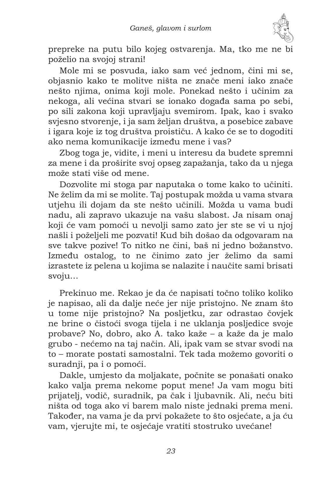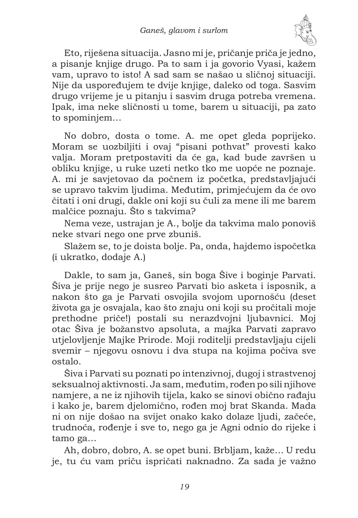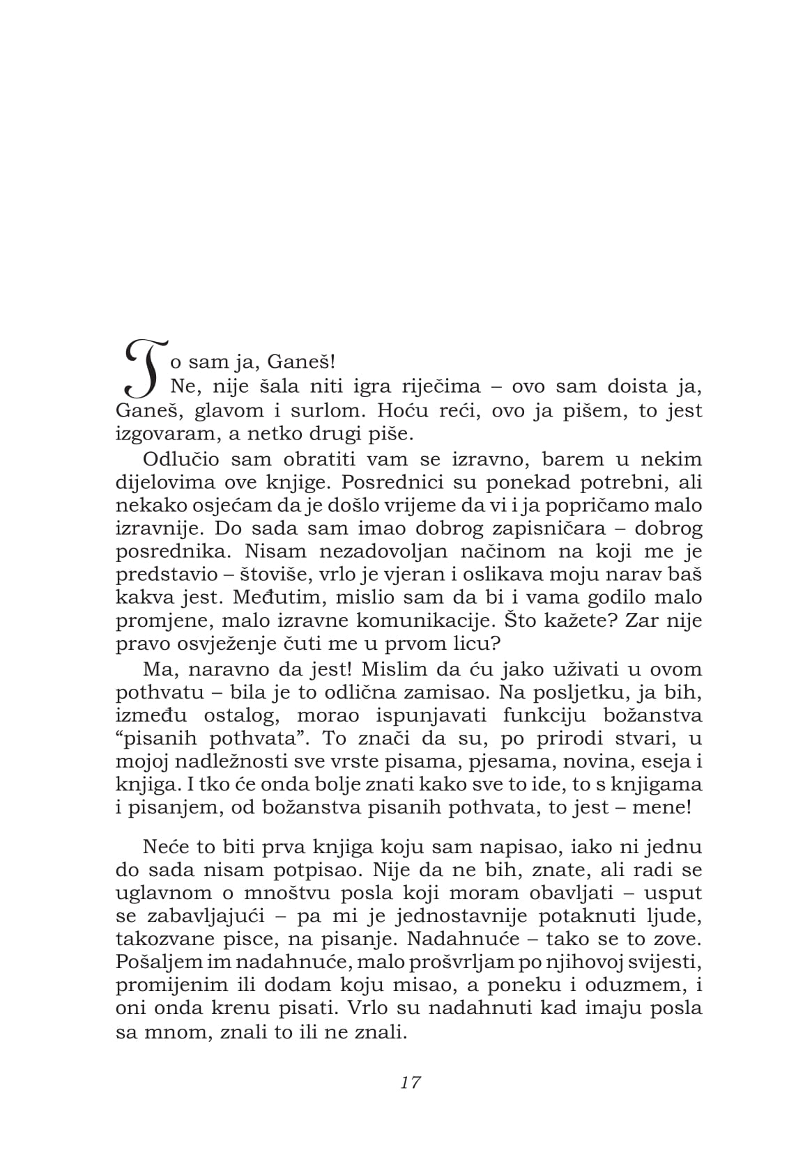 Ganeš… Njegovo je ime planetarno poznato, baš kao i lik debeljuškastog božanstva s tijelom čovjeka i glavom slona. Pun vrckavih šala i iznenađujućih poduka, uvijek se nekako nađe u središtu zapleta koji oduševljava. Ako ne pripazite, s veseljem će vam smjestiti zbunjujuću nepodopštinu od koje će vas zaboljeti glava. Ali, na kraju, kad to prođe i kad pogledate oko sebe, shvatit ćete da je čak i to bilo za vaše dobro.