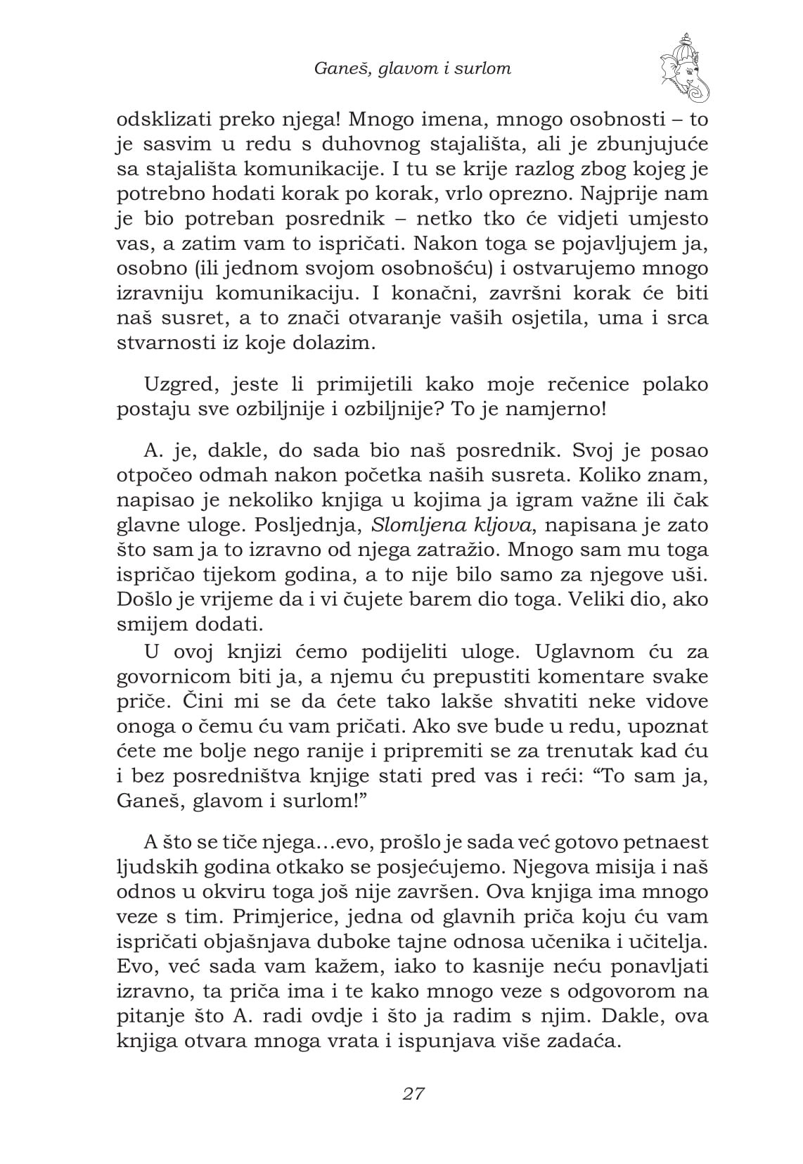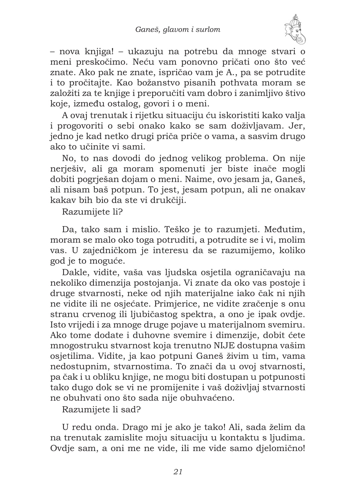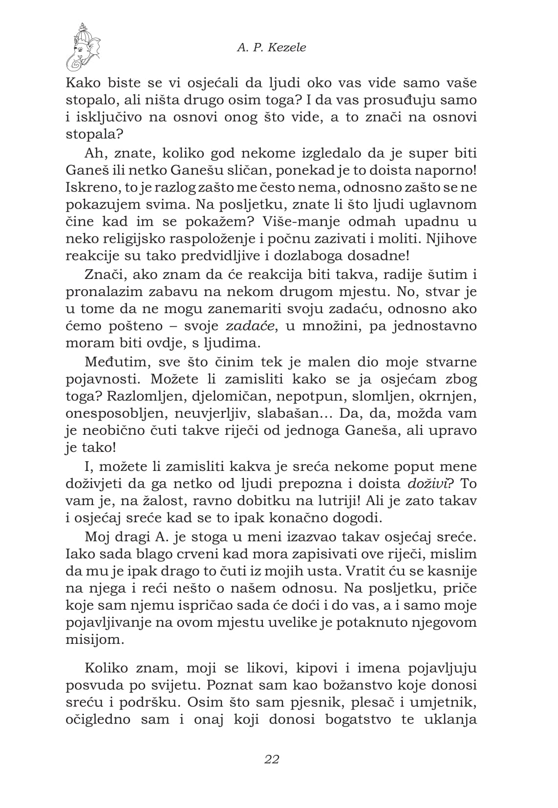 Ganeš… Njegovo je ime planetarno poznato, baš kao i lik debeljuškastog božanstva s tijelom čovjeka i glavom slona. Pun vrckavih šala i iznenađujućih poduka, uvijek se nekako nađe u središtu zapleta koji oduševljava. Ako ne pripazite, s veseljem će vam smjestiti zbunjujuću nepodopštinu od koje će vas zaboljeti glava. Ali, na kraju, kad to prođe i kad pogledate oko sebe, shvatit ćete da je čak i to bilo za vaše dobro.