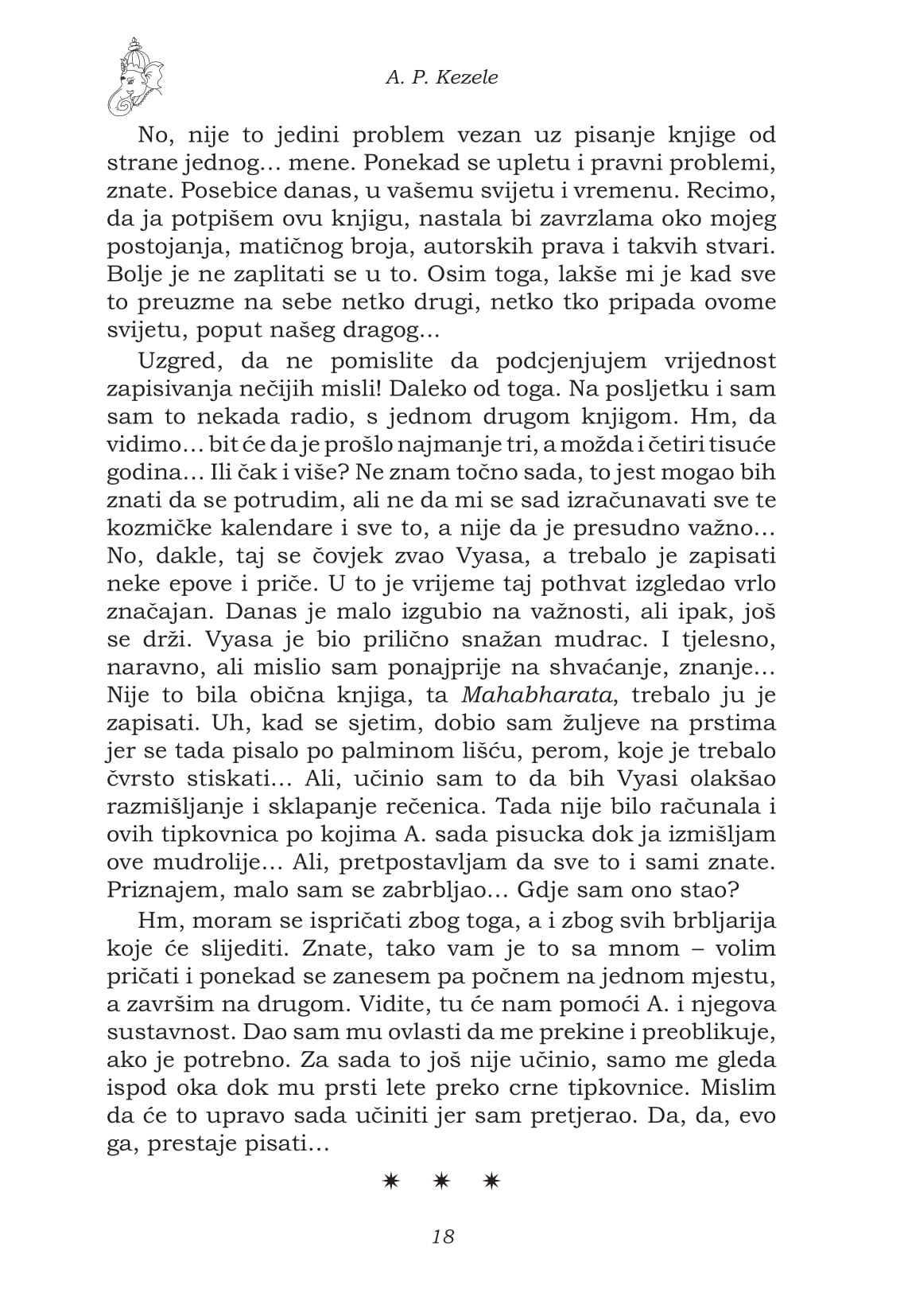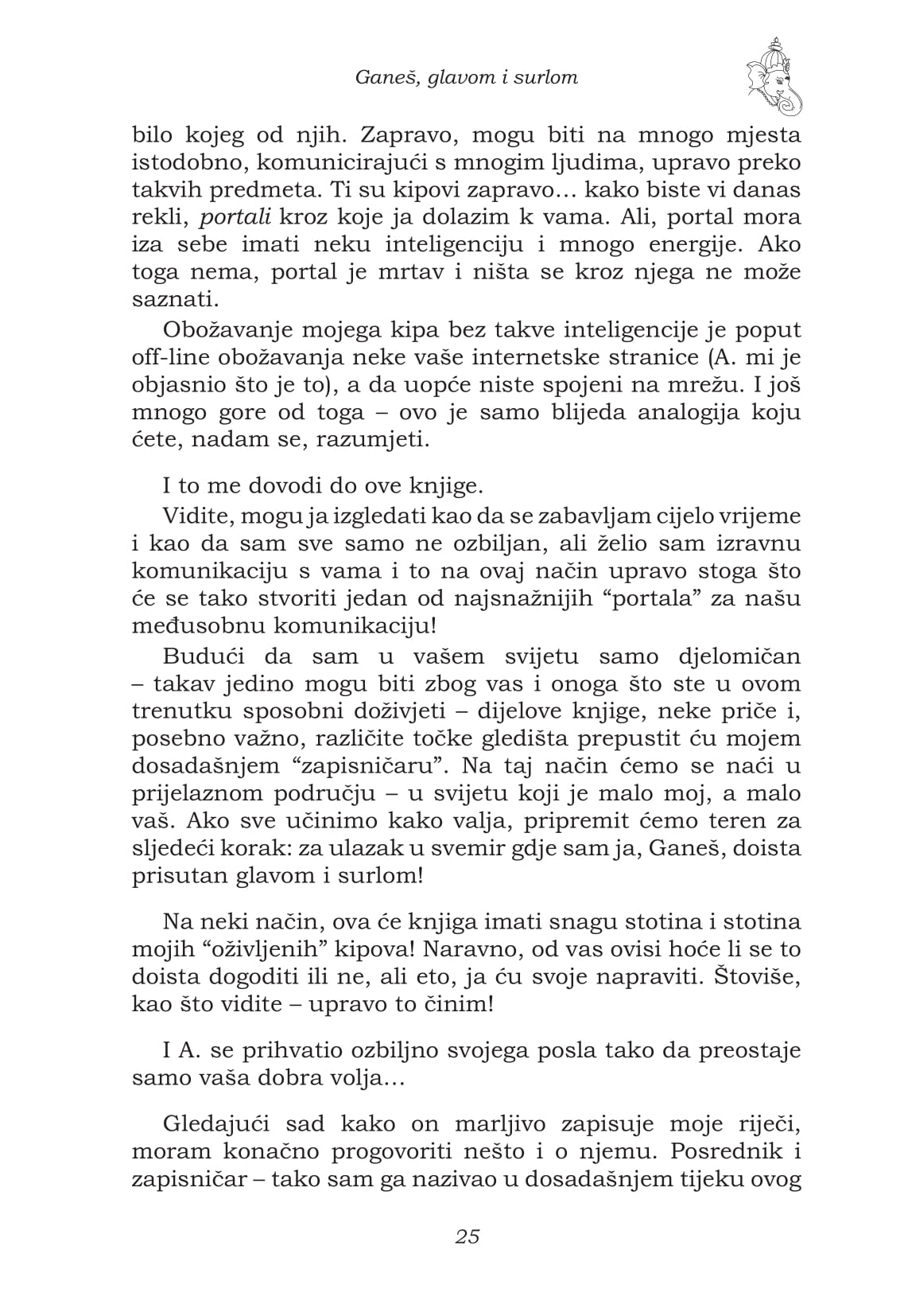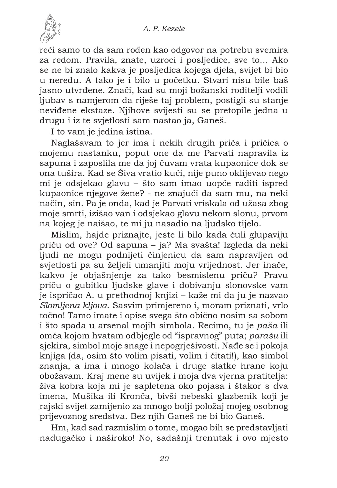 Nakon knjige “Slomljena kljova" A.P. Kezele nas vodi sve dalje u Ganešov svijet priča i parabola. Zapravo, ovaj put pero je preuzeo sam glavni junak tih priča – Ganeš, glavom i surlom! Pripremite se za još jednu nezaboravnu pustolovinu u kojoj ćete saznati zašto su bogovi bogovi, a demoni demoni. U ova teška vremena vjerojatno će vam dobro doći priča o čintamaniju – dragom kamenu koji ispunjava sve vaše želje. U svrhu vaše djelotvornosti, preporučuje vam se poznanstvo s Ganešovim moćnim bratom Skandom. Ali, ima tu mjesta i za cijelu mnogobrojnu Ganešovu obitelj, kao i druge likove poput mudraca Agastje, demona Tarake i Ravane, božanske rijeke Kaveri, sasvim mlade boginje Santoši… i naravno, Ganešovih nezaobilaznih i ponosnih roditelja Šive i Parvati.